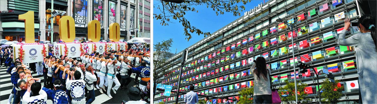 일본 마이니치신문사는 지난 28일‘도쿄올림픽 D—1000일’을 맞아 국제올림픽위원회(IOC)에 가입한 206개국 국기(國旗)로 사옥 외벽을 조각보처럼 감싸는 이벤트(오른쪽 사진)를 시작해 다음 달 5일까지 진행한다. 마이니치신문사 사옥이 각국 관광객이 몰리는 황궁 앞에 있다는 점을 활용해 2020년 열리는 도쿄올림픽에 관심을 유도하는 프로젝트다.