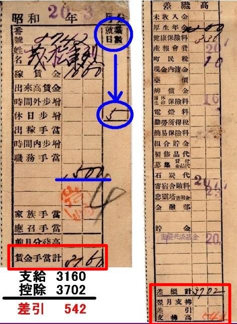 写真は、(C)の拡大写真。 拡大すると、昭和20年3月の給与明細。出勤日数は月で5日だったと判る>>30