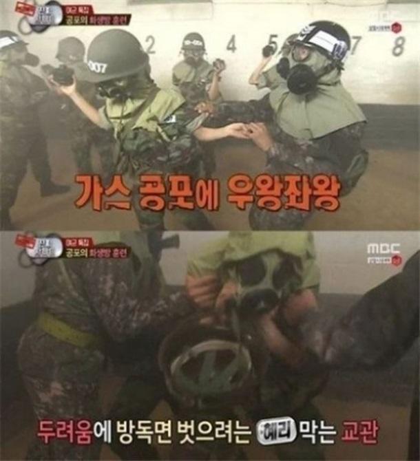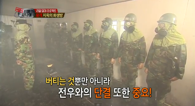 아래 장면은 방독면 착용 후, 가스로 가득 찬, 가스실에 투입. 정화통 교체 훈련과
