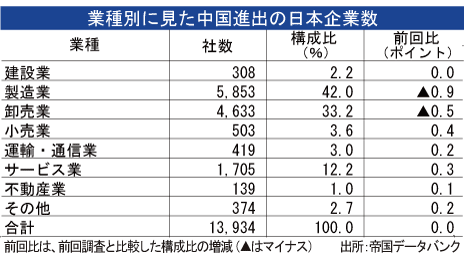 また、前回調査から中国進出が進んでいる業種を見ると、「製造業」、「卸売業」、「サービス業」