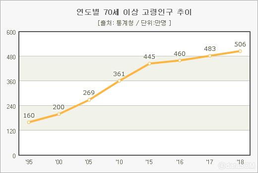 韓国人のうち、70歳以上の人口は、506万人に500万人を突破した。2005年269万人を記録した70歳以上の人口は、同じ期間の2倍近く増加した。