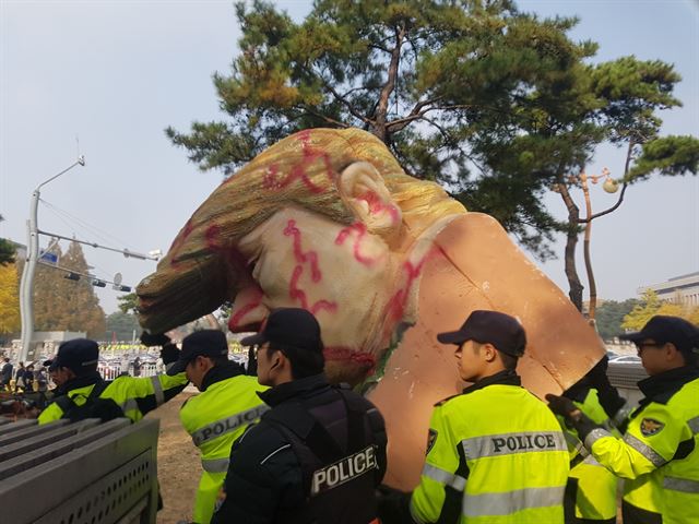 220反米性向の市民団体が集まった「NOトランプ共同行動(共同行動)」は、午前10時トランプ大統領訪韓反対記者会見を開き、「トランプ大統領が韓半島周辺の軍事的緊張を高めている」と批判した。共同行動は、当初、国会正門前で記者会見を開く計画だったが、警察のコントロールにKB国民銀行の前で集会を行った。トランプ訪韓反対デモ隊(主催推定1,000人、警察推算550人)は、「トランプの国会演説は、国民に対する侮辱」と「NO TRUMP NO WAR」、「トランプは退け」などのスローガンを叫んだ。これら星条旗が描かれたミサイルモデルを蹴っ壊したり、トランプ大統領が描かれた大型垂れ幕に塩を振りかけて破るパフォーマンスを繰り広げ、強力な抗議の意思を伝えた。