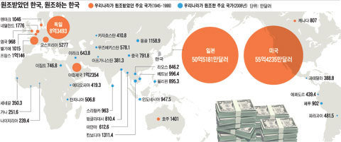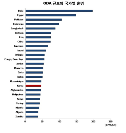 1960년대 이후 전 세계 개발도상국들이 받은 원조규모와 비교해 볼 때, 우리나라가 받은 ODA 총액은 20위(2010년 가치로 환산하면 약 500억 달러) 정도 수준이며, 이는 순 총량으로 공여국들은 원조가 가능한 자원 중 적지 않은 양을 우리나라에 할애해 준 셈이지만, 이는 남한만으로도 총 인구 3,000만명에 육박하며, 처참한 기생적 경제 상황과 달리 순수 내수 경제의 규모는 상당했었기에 특별히 막대한 양의 원조를 받았다고 볼 수도 없다.[140]