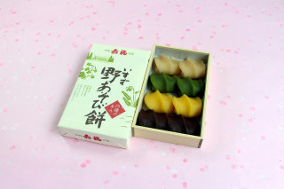 「いすず 野あそび餅」には「黄色い赤福」のほか、白小豆などで作った「白い赤福」と、大麦若葉を練り込んだ「緑の赤福」、黒砂糖風味の「黒い赤福」の計4種類が2個ずつ入る。従来は、黄色の代わりに定番の赤福が入っていた。