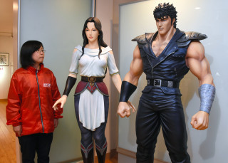 開館7周年と同作品の35周年を記念した企画展。会場では、ケンシロウと恋人「ユリア」のフィギュアが出迎える。歴代フィギュアや名シーンを再現したジオラマ、漫画を担当した原哲夫さんの複製原画などが並ぶ。同社の造形師が塗装したケンシロウと3番目の兄「ジャギ」の胸像は色合いが繊細で、来場者の関心を引く。