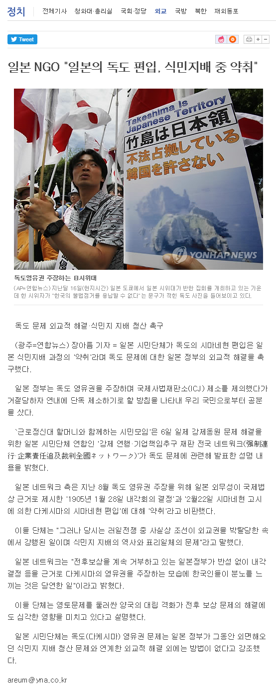 일본 NGO "일본의 독도 편입, 식민지배 중 약취"