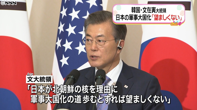 韓国の文在寅大統領はシンガポールのテレビ局とのインタビューで、「日本が北朝鮮の核を理由に軍事大国化の道を歩むとすれば、それは望ましくない」と発言した。