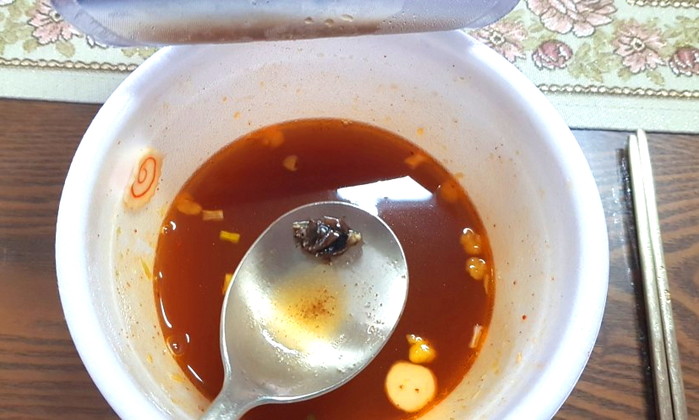 韓国で販売されているインスタントのユッケジャンからゴキブリが 噛みきったあとに気付くという事態に