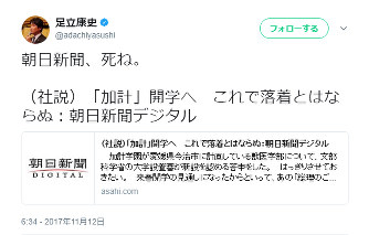 維新:足立議員、ツイッターに「朝日新聞、死ね」と投稿 - 毎日新聞 https://mainichi.jp/articles/20171114/k00/00m/040/057000c …