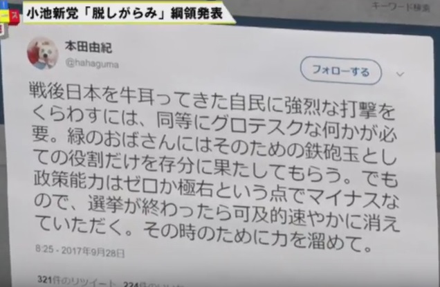 小池代表は安倍首相が衆院解散を表明した今年9月25日、自らが代表を務める希望の党を設立。