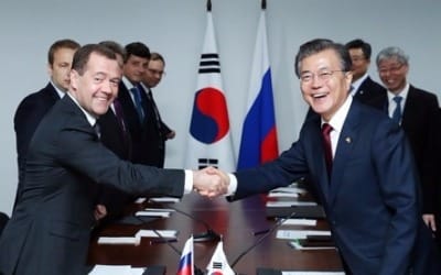 메드베데프 총리는 “러시아 정부는 (9개의 다리 등의) 구상을 현실화할 준비가 돼 있고 현재는 실질적인 모멘텀을 시작하는 게 중요하다”며 “(한·러 간) 아주 좋은 우호 관계가 이어지고 있다”고 강조했다. 또 북한 핵·미사일 프로그램을 절대 용납할 수 없다며 러시아는 한반도 인접 국가인 만큼 한반도의 안정은 러시아 안보와 직결돼 한반도 평화·안정을 위한 한국의 입장을 지지하며 이를 위해 적극적으로 노력하겠다고 말했다. 그는 “한·유라시아 FTA에 대해서는 한국 측과 긴밀히 협의할 의향이 있다”며 사할린 액화천연가스(LNG) 사업, 극동 지역 조선업 현대화사업, 수산물·농산물 분야에서의 양국 간 협력 의지를 밝혔다. 문 대통령은 “한·러 관계를 외교·안보 정책상 최우선순위에 두고 있으며 한·러 간 전략적 협력이 한반도·동북아는 물론 유라시아 대륙의 평화·안정과 번영에 구심점이 되도록 노력해나갈 것”이라고 답했다.