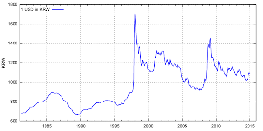韓国のデフォルト危機はすでに2回あった。1997通貨危機と2008リーマンショック。下のグラフの2つの山がそれだ。