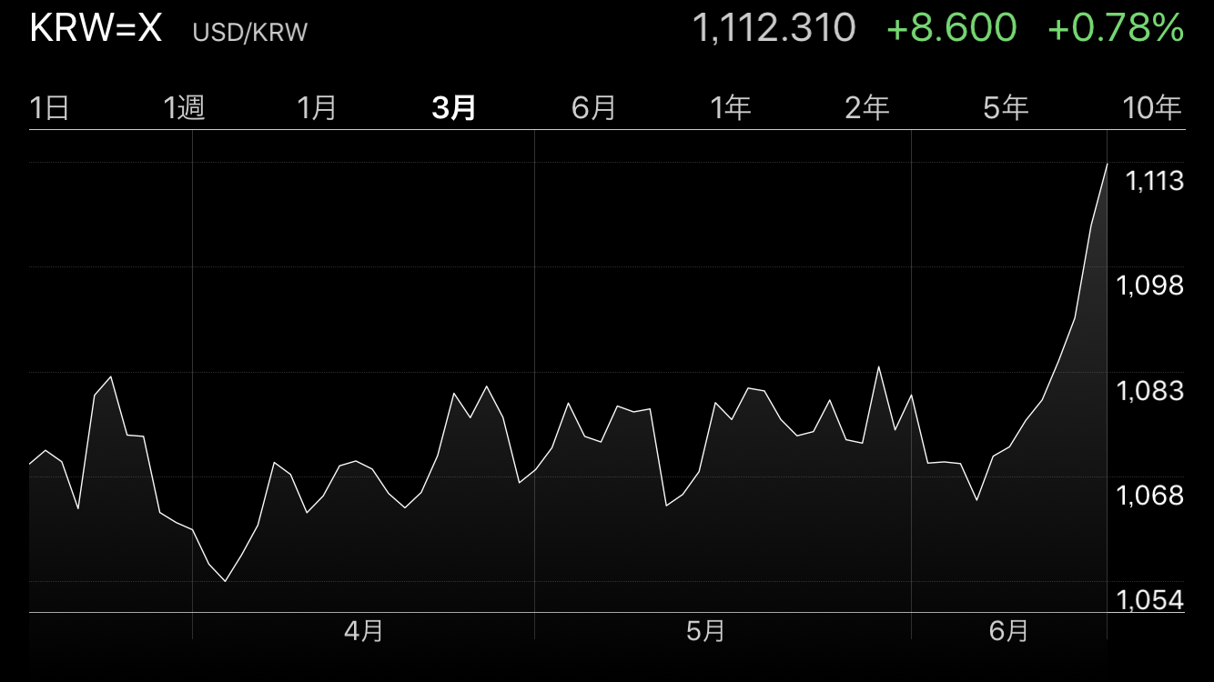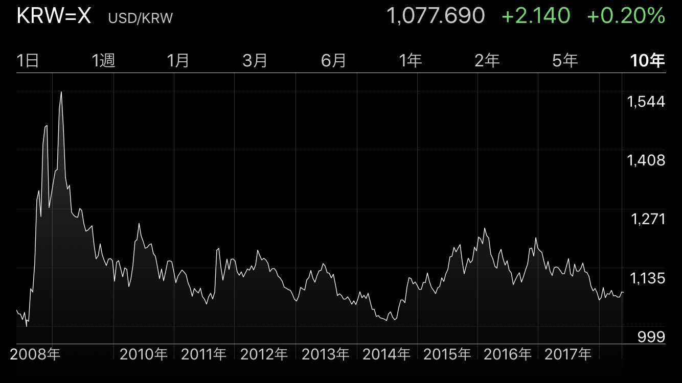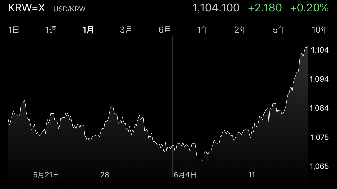 と言っても、米朝会談が決裂したとしても1ドル1100ウォンにまで戻らないし、ノーベル平和賞ものの成果が出ても1050ウォン近辺でしょうな。