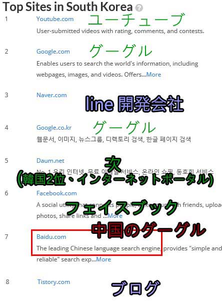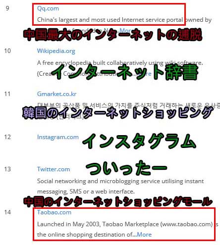 내 기억에 따르면, 1위는 'Naver'였으나, 나머지 순위에서 대부분이 중국의 웹사이트였다. 'Baidu'는 한국인들이 잘 알고 있었지만, 'QQ' 같은 것들은 한국인들에게 매우 생소한 것인데, 이런 것이 최상위 순위를 차지하고 있었다. 그외에도 중국인이 아니면 전혀 알려져 있지 않은 것들이 대부분의 순위를 차지했다.
