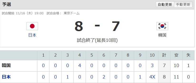 日本は3-4の九回、1死から2四球と安打で満塁として京田(中日)が押し出し四球で追い付き延長戦に持ち込み、十回に3点を失ったが、上林(ソフトバンク)の3ランで追い付き、田村(ロッテ)の二塁打で試合を決めた。