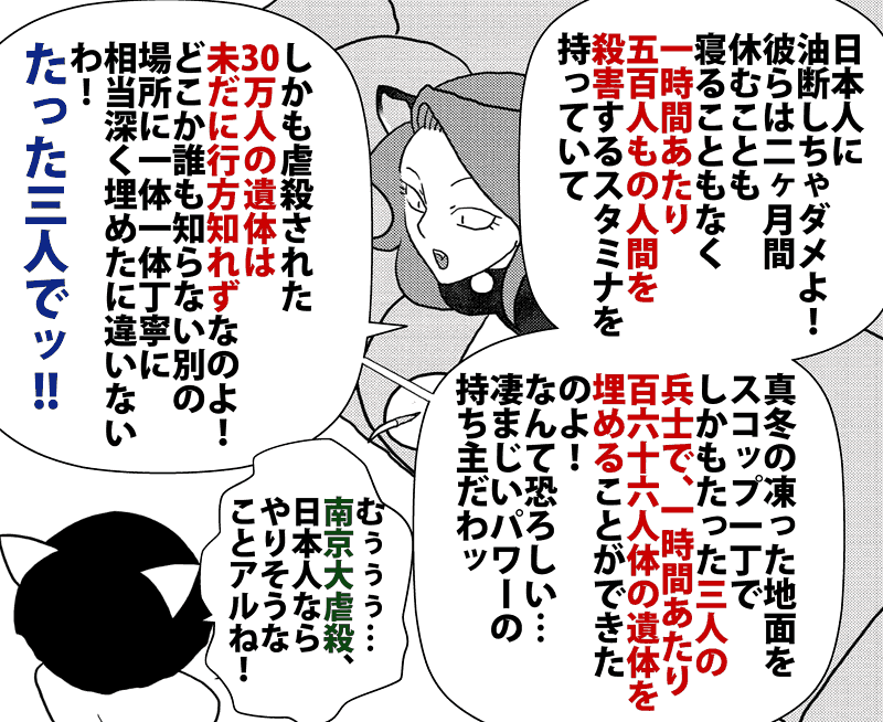 あのような短期間であの兵士の数であの物量で、30万人の支那人を虐殺したのに目撃者や骨や遺体など証拠のひとつも残さないんだぞ