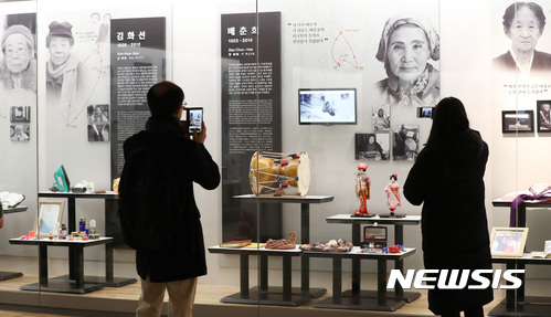 元従軍慰安婦が共同生活を送っている京畿道広州市の福祉施設「ナヌムの家」で18日午前、元慰安婦の「遺品展示館・追悼記録館」開館式が開かれた。写真は、展示を見て回る出席者らの様子。