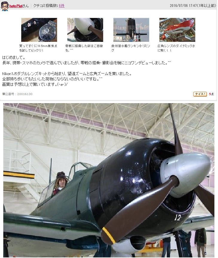 「零戦に搭乗した姿はご容赦を。^^」と価格COMでコメントしながら、