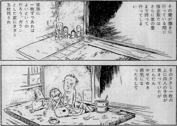 その結果、妻が働いている間に借金取りが家の畳まで持っていき、子供は下の子から順番に死んでいったという。
