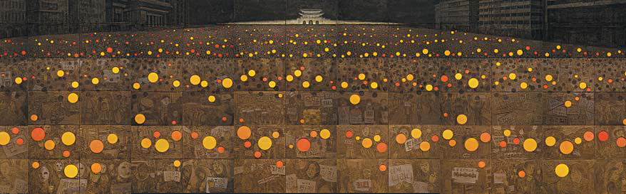 朴槿恵のブラックリストに上げられた筋金入りの左派芸術家のイム・オクサン。彼がキャンドルデモを描いた縦3.6メートル、横11.7メートルとかなり大型だ絵画だ。昨年末に光化門のキャンドル集会の現場を訪れたイム氏が78枚のキャンバスに描いた絵をつなぎ合わせ、当時の状況を表現したものだ。