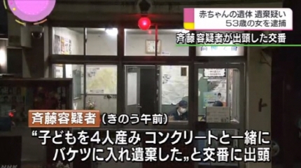 오늘 21일 NHK 및 지지통신 등에 따르면 오사카 네야가와시에 사는 53세 여성은 지난 20일 경찰서에 자진 출두해 “아기 4명을 낳아 시체를 유기했다”고 밝혔다.