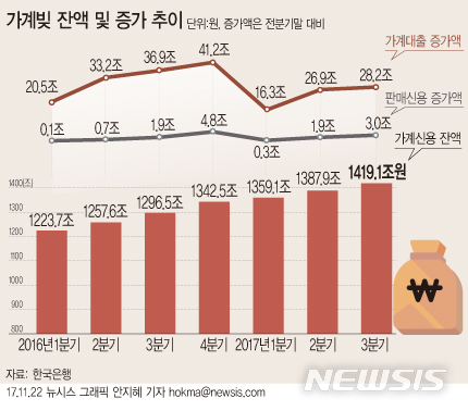 가계신용은 은행, 저축은행 등 예금취급기관과 보험사 등 기타금융기관의 가계대출 잔액과 카드사와 백화점, 자동차 할부 등의 판매신용 금액을 모두 더한 것이다. 최근 금융당국이 발표한 10월 금융권 가계대출 증가액이 10조원인 점을 감안하면 현재 가계부채는 1430조원을 넘어섰을 가능성이 높다.