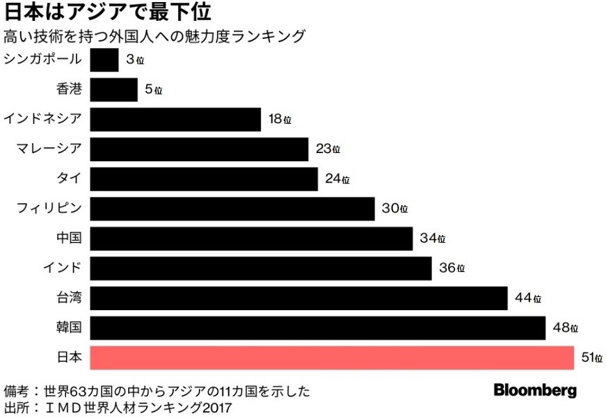 スイスのビジネススクールIMDが発表した2017年版世界人材ランキング(高度外国人材 魅力度ランキング)によると、調査対象のアジア11カ国中、日本は高度外国人材にとって最も魅力がないという結果になった。
