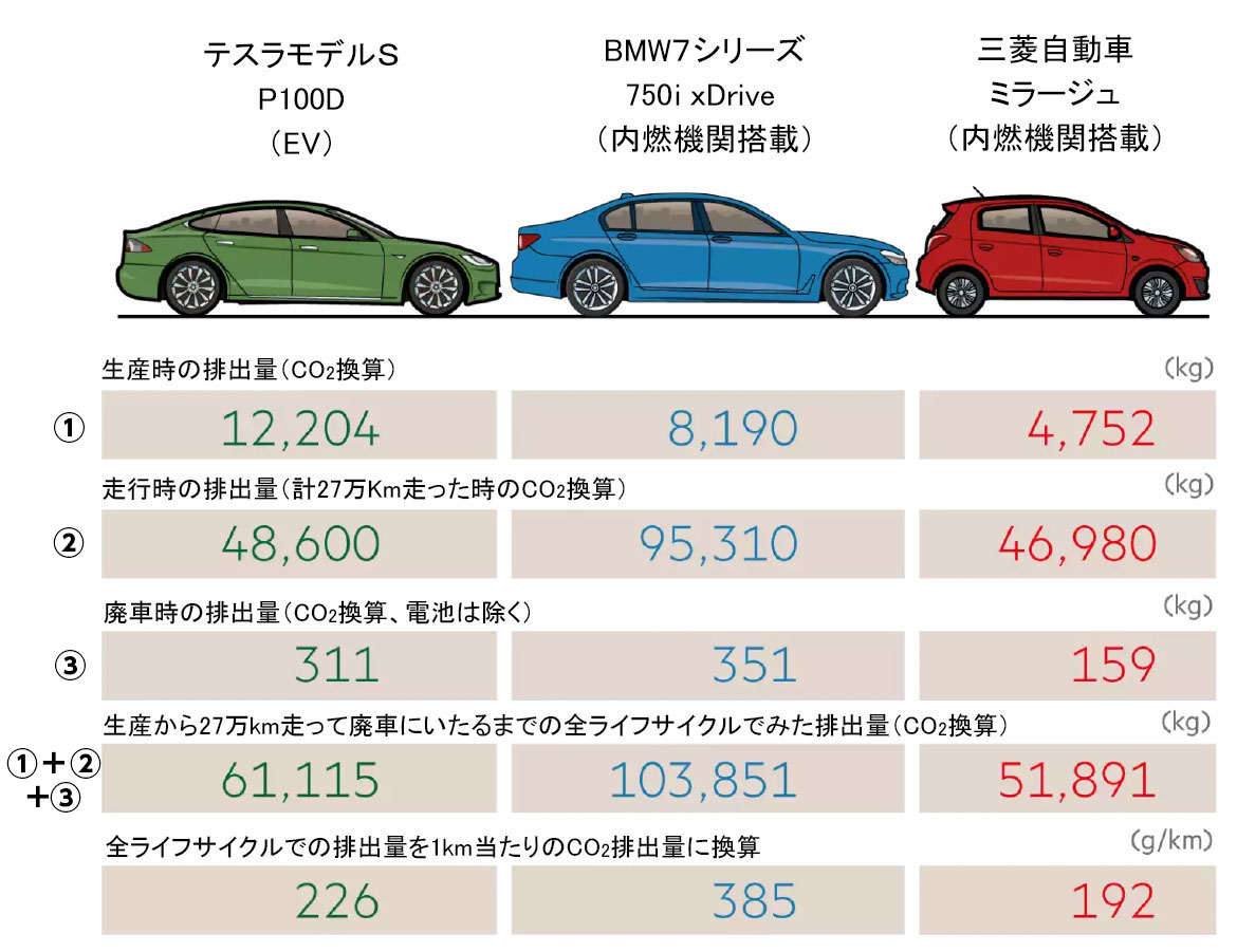 しかし、部品の調達から燃料、部品の再利用に至るまで、つまりクルマが誕生する過程から廃車までの全ライフサイクルで弾き出した二酸化炭素(CO2)排出量で見ると、話は違ってくる。発電によるCO2排出量が多い地域(例:米中西部)で使用すると、米テスラが販売する一部の電気自動車(EV)よりも、エンジンを搭載しているミラージュの方が環境に優しいことになるのだ。