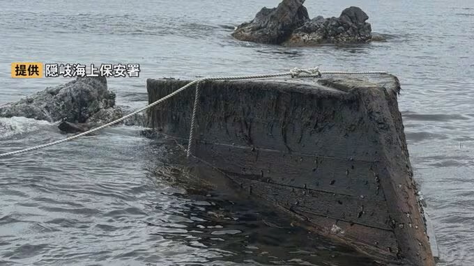 船は隠岐の島町津戸の海岸に漂着しているのが確認され、長さ約6.5メートル、幅約1.7メートルの木造船で、船体の外板には黒色の「コールタール」のような塗装が施されていたということです。