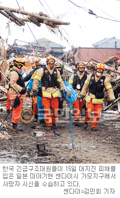 지난 12일과 14일 잇따라 미야기현 센다이시에 파견된 한국 긴급구조단 105명. 무너진 건물 잔해를 뒤지고 진흙 속을 헤치며 그 어딘가 생명의 끈을 놓지 않고 있을 생존자를 찾아 지금도 센다이시 아라하마와 다가조시 등을 훑고 있다. 방사능 보호복과 제독약 다 가져왔다. 시간에 맞춰 방사능 측정도 하고 있다. 하지만 재난현장을 서둘러 빠져나가는 외국 구조대를 쳐다보면 방사능 피폭에 대한 두려움이 불쑥불쑥 솟는 것도 사실이다. 한국에서 연일 애를 태우고 있는 가족들 얘기를 들으면 마음이 더욱 무거워지기도 한다. 그러나 시간이 흐를수록, 그래서 생존자 구출 가능성이 점점 줄어들수록 함께 줄어드는 게 있다. 방사능에 대한 공포다. “일본을 돕기로 했으면 실제로 돕고 가야 한다.” “이재민들이 다시 일어설 수 있도록 복구활동을 도와야 한다. 그래야 우리가 떳떳하게 귀국행 비행기를 탈 수 있다.” 이동성 단장(53)의 말이다.>>159