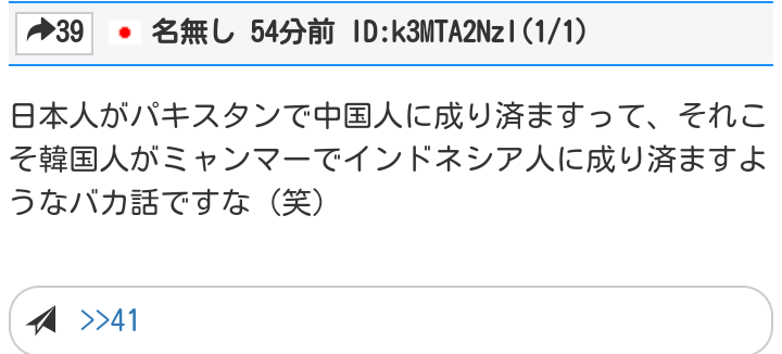 ミャンマーだと韓国人は好かれていて、インドネシア人は嫌われているから、わざわざ嫌われている人種の振りする意味が分からんという意味じゃねーの。そもそも、パキスタンに行く日本人がどれだけいんだよって話だな。
