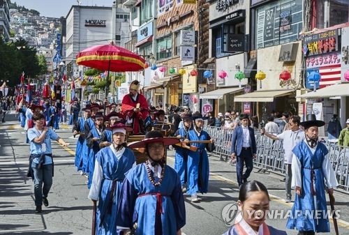 朝鮮王朝時代に日本に朝鮮の文化を伝えた外交使節団「朝鮮通信使」の行列再現を19日に山口県下関市で行ったと伝えた。