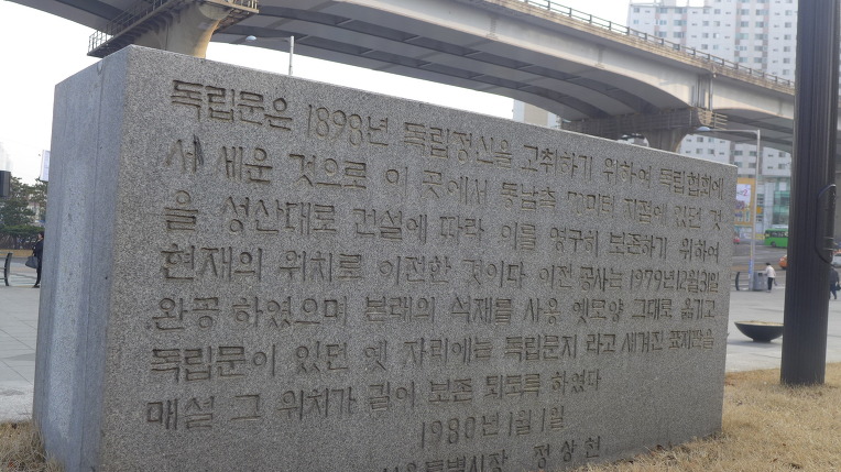 独立門は1898年に独立の精神を鼓吹するために独立協会で立てたものでここで同南側70m地点にいたことを、城山通り建設に基づいて、これを永久に保存するために、現在の位置に移転したものである。以前工事は1979年12月31日に完成し、本来の石を使用し、古い形のまま移し独立門があった昔の桁には、独立門かと刻まれた標識を埋設その位置が長く保存されるようにした。1980年1月1日、ソウル特別市長ジョンサンホン