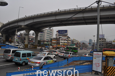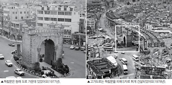 建設された高速道路(高架)は移転前の独立門を避けてカーブを描いてた。