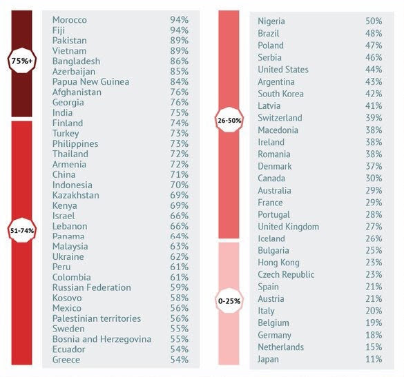 その通りというか、この結果って、戦争より平和がいいと思っている国ほど低く、戦争中な国ほど高くなっているという結果だからね。曖昧な質問だから、ようは「世界で戦争を望むか」「世界で平和を望むか」どちらの国民の方が多いか?という結果だと思えばいい。