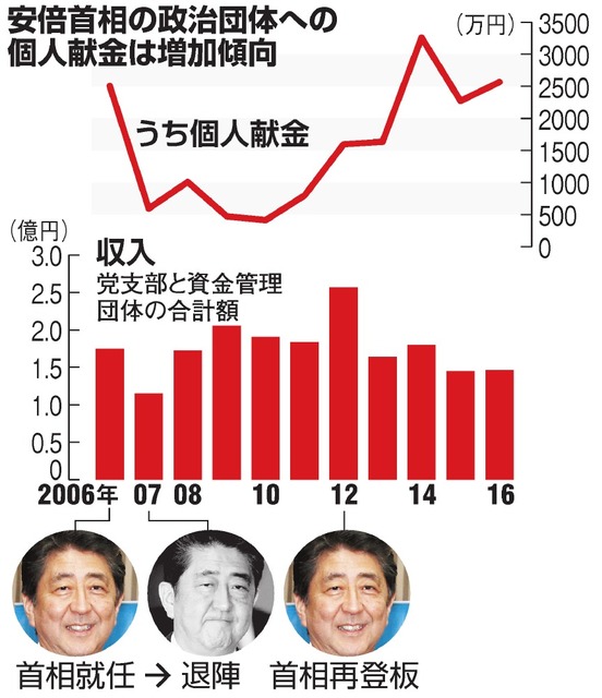 収支報告書によると、安倍首相が代表を務める政党支部と資金管理団体の16年の収入はあわせて
