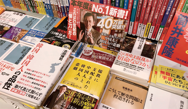 今年に入って日本で出版された、いわゆる「嫌韓書籍」のタイトルである。韓国と韓国人を刺激するこのような嫌韓書籍は、日本の書店に堂々とコーナーを飾っている。この中には数十万部売れたベストセラーもある。去る2月に出版された「儒教に支配された中国人と韓国人の悲劇」という本は、これまでおよそ40万部が売れた。この本はケント・ギルバートという親日寄りのアメリカ人が日本は肯定的に、韓国と中国は批判的に眺めた内容を盛り込んでいる。おそらく日本の読者たちは、韓・中・日ではなく、第3者のアメリカ人の視点で韓・日、中・日関係を眺めたという点に関心を見せているのだろう。