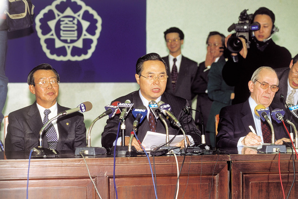 (写真)1997年12月3日、経済副首相(中央)が国際通貨基金(IMF)の救済金融交渉妥結を発表している。>>4