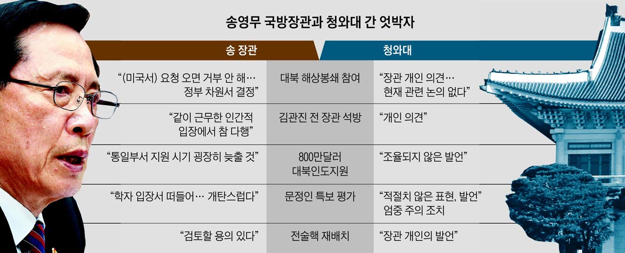 四つ星将軍にして米韓同盟重視派のソンヨウンム国防長官と青瓦台の軋轢が深まっている。