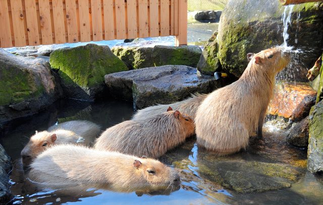約40度の「温泉」につかったカピバラ一家は、身を寄せ合ったり、目を細めたりして気持ちよさそうに過ごしている。