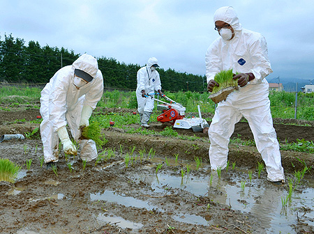 お前、これ2012年6月の、大熊町職員による「放射性物質が農作物にどの程度取り込まれるかを調べるための町内の田畑でコメと野菜の試験作付け」の画像じゃねえか。