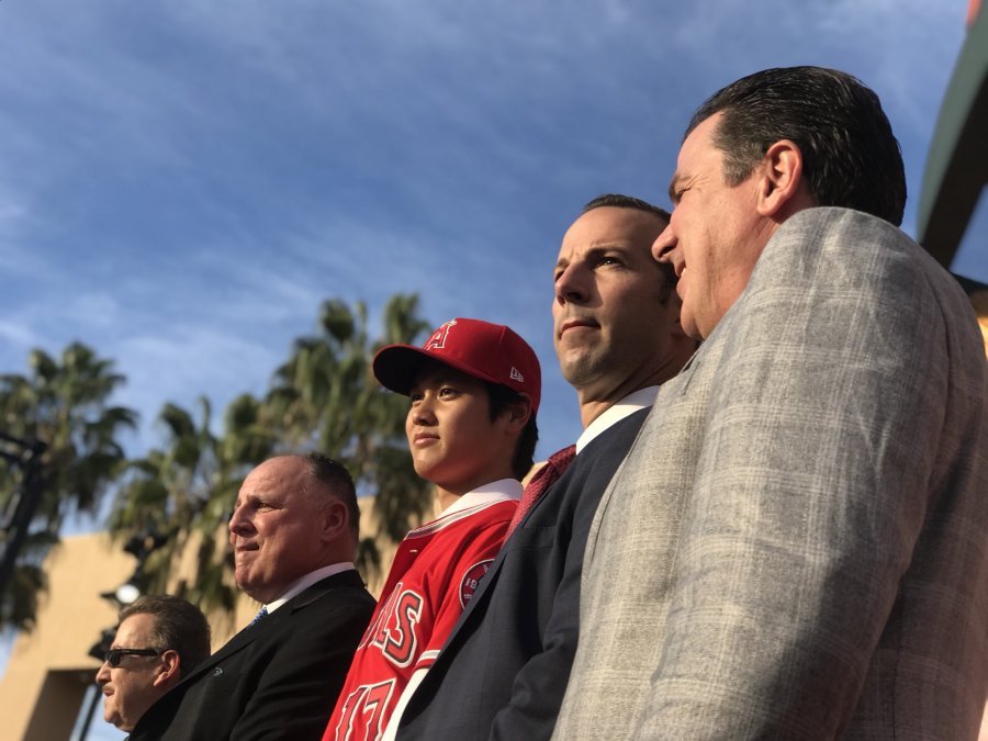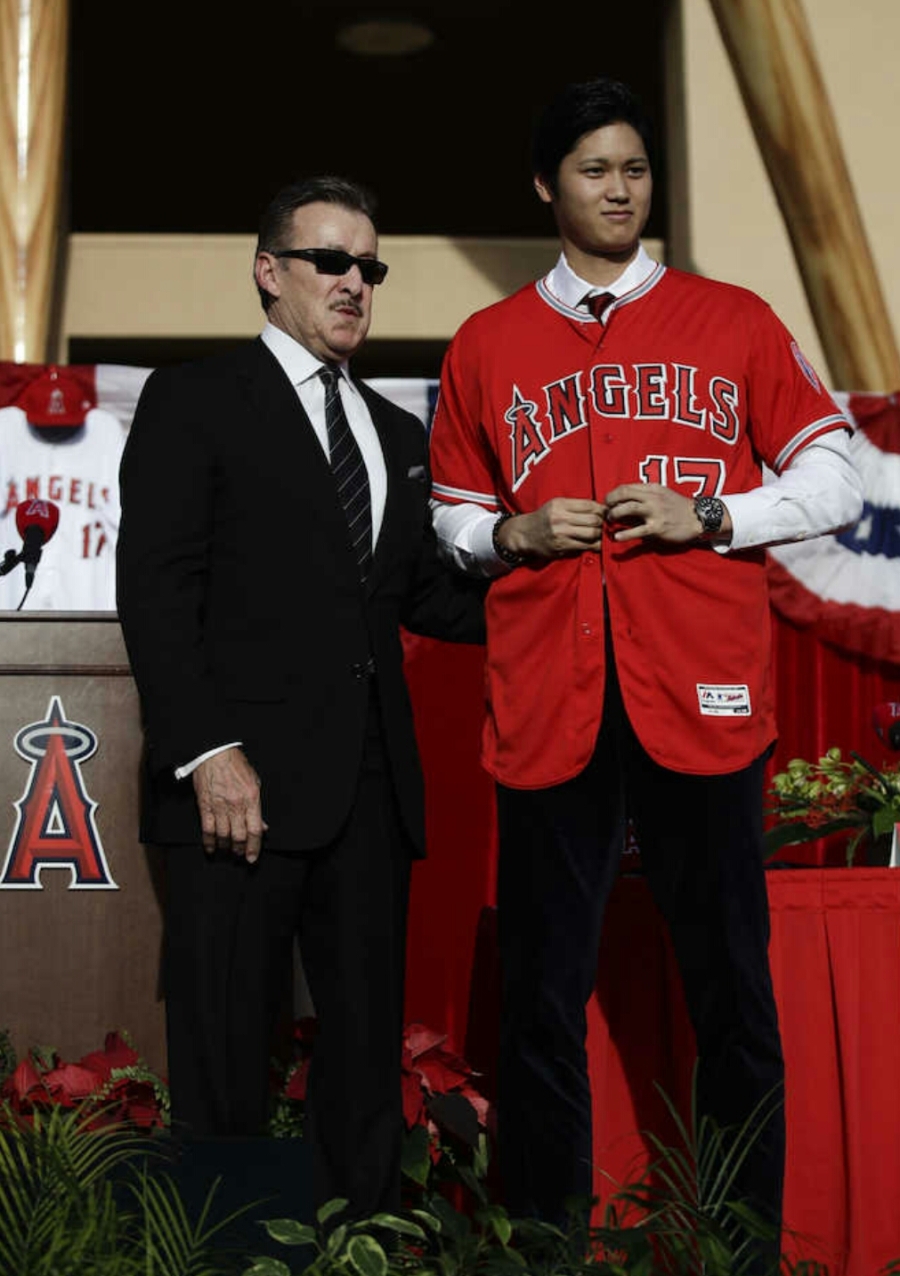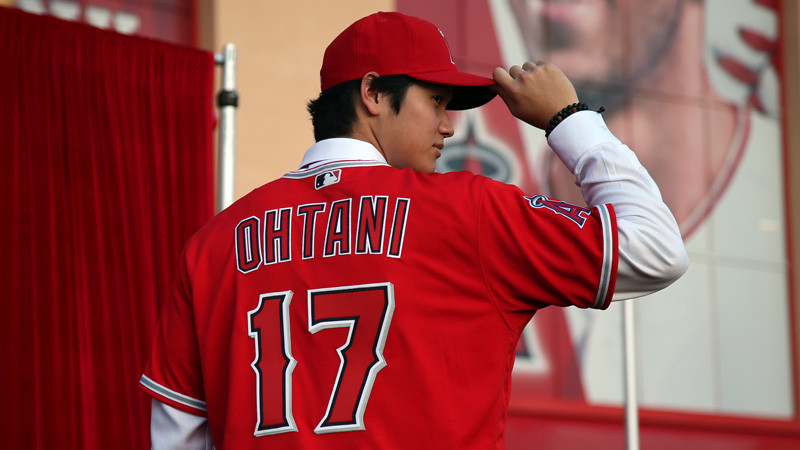会見はファンに公開され、ソーシア監督、モレノ・オーナーらが同席。大谷は早速、新背番号「17」がついた真っ赤なユニホームに袖を通し、冒頭に英語で自己紹介し「これからエンゼルスの一員としてファンの皆さまとともに優勝を目指したい」と抱負を述べた。