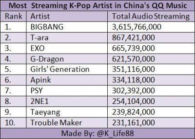 19名無し2017/12/12(Tue) 05:16:01ID:g2Mjg2OTY(3/139)NG報告중국최대음원사이트 QQ뮤직 Most streaming K-Pop artists in China's QQ Music (Sub groups are included on the main group)일본 -> 30%도 안 됨>>59>>611