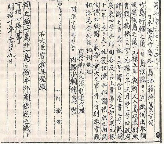 それに対して太政官は『伺いの件、竹島と他一島の件は本邦と関係無しとして良いと心得る事。』という回答をした