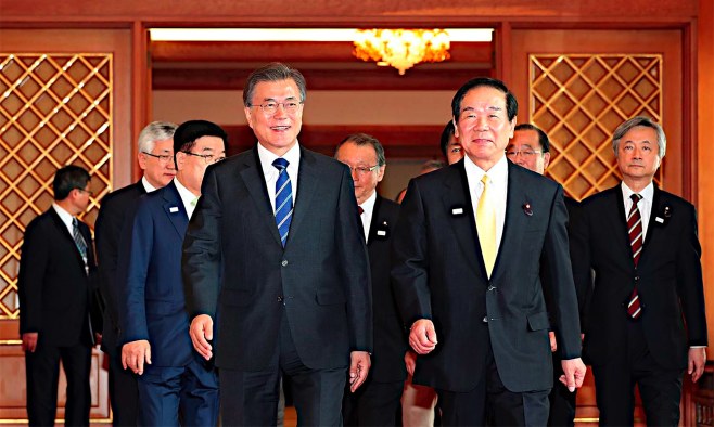 韓国の文在寅大統領(左)と日韓議員連盟会長の額賀福志郎元財務相=ソウルの韓国大統領府(韓国大統領府提供)【時事通信社】絶対反対‼︎