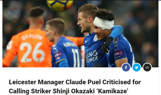 영국 런던 '90min'은 11일(이하 한국시간) "레스터 시티의 클로드 퓌엘 감독은 자신의 팀 오카자키 신지를 가미카제로 비유해서 비난받고 있다"고 보도했다.