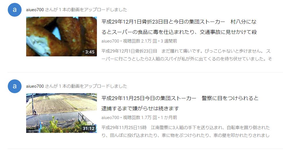 集団ストーカー(警察・NHK・宗教団体・右翼団体・宅配便・通行人・農作業してる人・ヘリコプター・飛行機・トラック・学校給食の配達の車)に狙われている集団ストーカーの被害者aiueo700さんの動画。