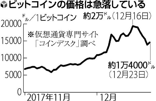 今月中旬から1週間たらずで一時、半分近くまで下落した。世界中の金融関係者などが「バブルだ」と指摘しており、先行きを不安視した投資家による売りが相次いだとみられる。