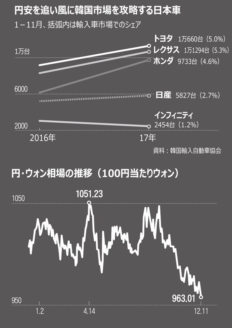 トヨタ、ホンダなど日本の自動車メーカー5社は今年1-11月に米国市場で600万3000台を売り上げた。シェアは昨年の37.2%から38.4%に上昇した。特に7-10月のシェアは48.7%を記録。米国で販売された自動車の2台に1台が日本車だった計算だ。一方、韓国の現代・起亜自動車の販売台数は116万9000台にとどまり、前年を10%以上下回った。日本車は韓国でも前年比25%増の3万9968台が売れ、輸入車市場でのシェアは18.8%に上昇した。