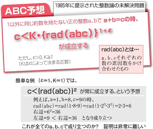 長年にわたって世界中の研究者を悩ませてきた数学の超難問「ABC予想」を証明したとする論文が、国際的な数学の専門誌に掲載される見通しになった。執筆者は、京都大数理解析研究所の望月新一教授(48)。今世紀の数学史上、最大級の業績とされ、論文が掲載されることで、その内容の正しさが正式に認められることになる。